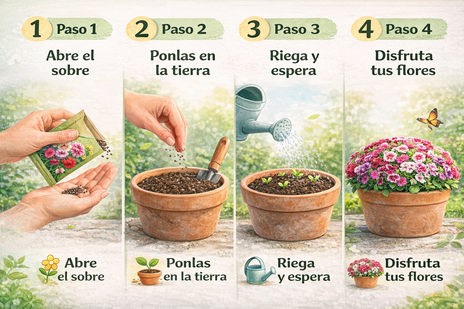 En pocas semanas verás los primeros brotes y luego flores llenas de color.